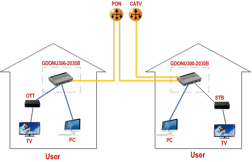 Overview        GDONU300-2030B is FTTH slaver combined GPON ONU and CATV optical receiver in one box. GDONU300-2030B series are optical network terminal targeting FTTH networking strategy. GDONU300-2030B includes a variety of models covering GPON SFU data type and double optical fiber type. The double optical fiber type is composed of CATV optical receiver and ONU; CATV optical receiver has the feature of low optical power receiving while ONU adopts compatible chips with GPON. In all, this series is well positioned to fulfill different FTTH networking requirement, providing reliable and secure service that come in all varieties. Features              ONU :